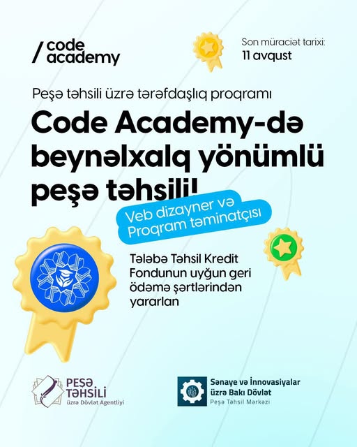 Code Academy və Peşə Təhsili üzrə Dövlət Agentliyinin əməkdaşlığı ilə həyata keçirilən beynəlxalq yönümlü peşə təhsili proqramı çərçivəsində “Veb Dizayner və Proqram Təminatçısı” ixtisası üzrə qeydiyyat başladı.